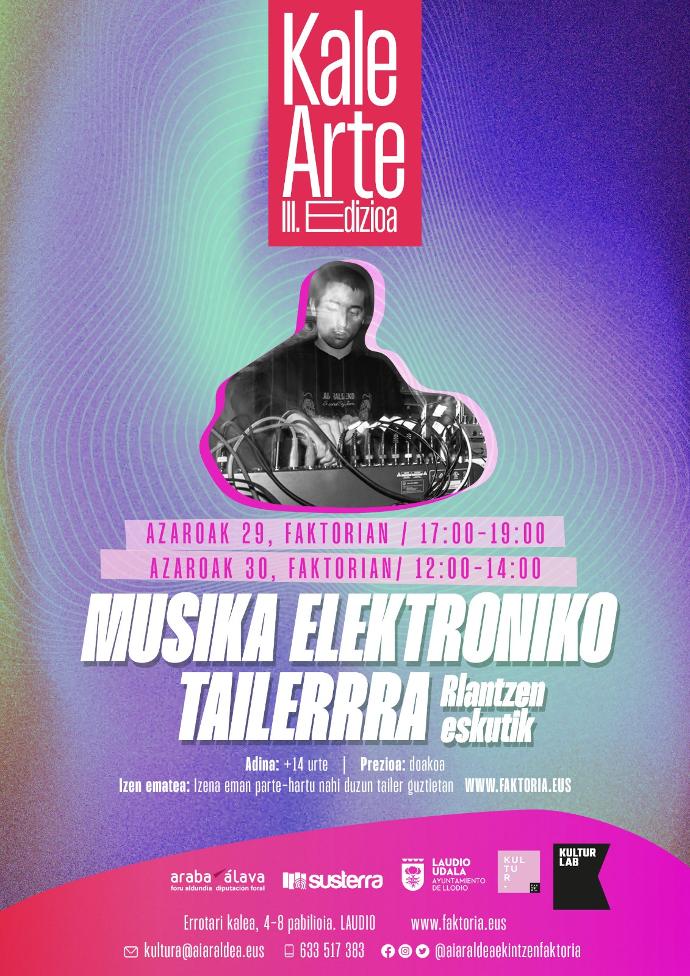 MUSIKA ELEKTRONIKOA tailerrean, musika elektronikoaren sorkuntza-prozesuan murgiltzeko aukera izango dute partaideek, horretarako oinarriak zein teknika ezberdinak ezagutuko dituzte. Horretaz gain, kantu bat produzituko dute eta bukeran, mahai analogiko batekin Live-dub egiteko aukera izango dute.